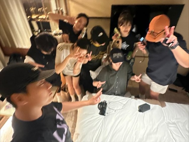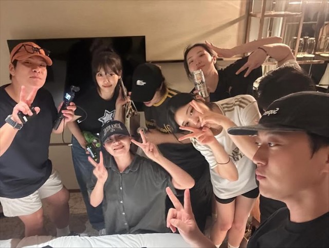 Recently, Lee Mi-joo posted several indoor photos on her SNS with the caption "Just Lee Mi-joo family ??." In the photos, she is sitting at a table wearing a black T-shirt, shorts, and a hat, looking straight ahead. In another photo, she is dressed in a white T-shirt and shorts, making a V sign with one hand, showing a bright atmosphere. The background of the photos features an everyday space with a TV, drinks, and a smartphone.