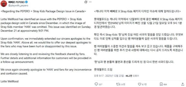 As the controversy grew, Lotte Wellfood issued an official apology on the 23rd. In its statement, the company acknowledged that Han’s image was mistakenly omitted during the design process of the Pepero x Stray Kids packaging sold in Canada since December.