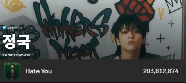 On Jungkook's personal Spotify account, there are 11 songs with over 200 million streams, including "Hate You," "Seven," "Standing Next to You," "Left and Right," "3D," "Dreamers," "Stay Alive," "Still With You," "Yes or No," "Never Let Go," and "Please Don't Change." Including the solo tracks "Euphoria" and "My Time" from the BTS album, a total of 13 songs have surpassed 200 million streams, once again proving Jungkook's stature as a global music powerhouse.
