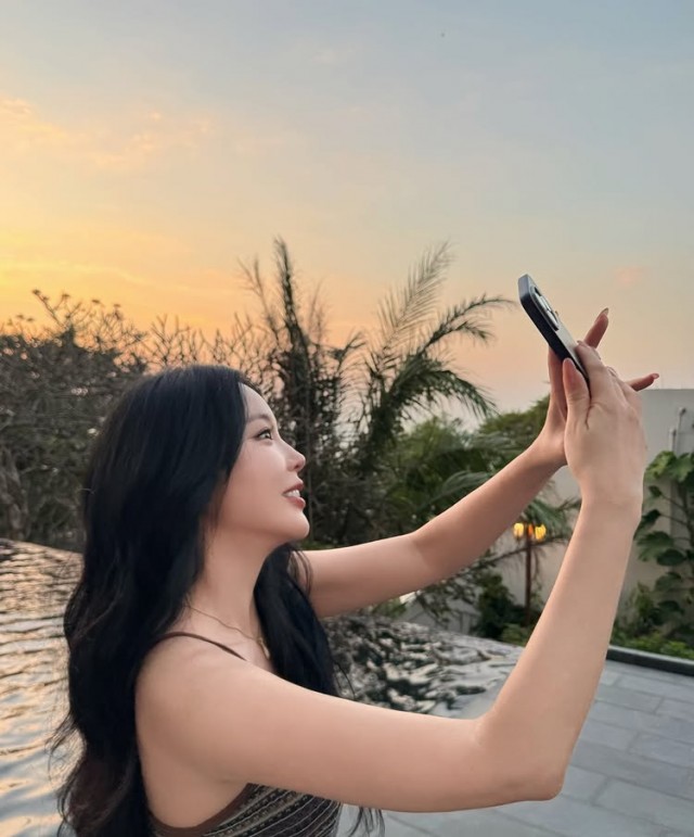 Trot singer Hong Jin-young attracted attention by showcasing a stylish swimsuit look. Recently, Hong Jin-young posted several photos on her SNS wearing a sleeveless swimsuit with a striped pattern. In the photos, she struck natural poses, such as lightly touching her hair with one hand while looking to the side or clasping both hands together while gazing straight ahead, exuding an elegant charm. The background, featuring a sunset over the water and trees, added to create a more atmospheric scene.