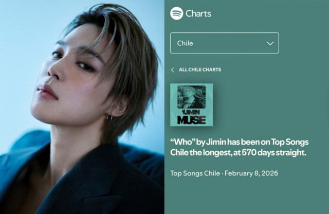 BTS Jimin set a new record as an Asian artist in Chile. The title track "Who" from his second solo album "MUSE" reached number 3 on the Spotify "Chile Daily Top Songs" chart on February 8, achieving a record of 570 consecutive days on the chart. This extended the longest consecutive charting record on that chart.